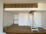 Cet appartement se compose d'une pièce principale avec deux grandes fenêtres sur rue en double vitrage bois, une kitchenette, une salle d'eau et une chambre en mezzanine de plus de 2m30 de HSP d'environ 10m2.