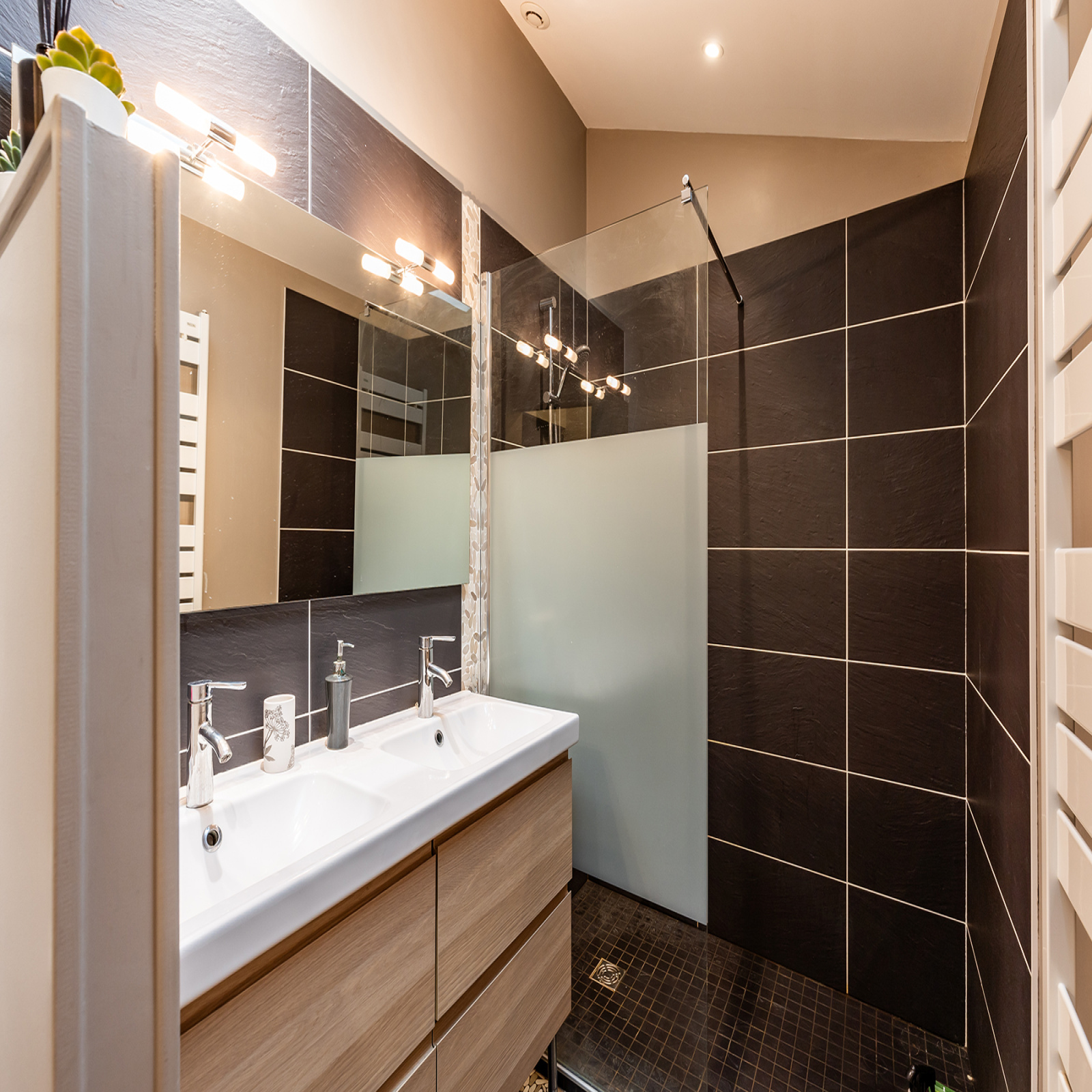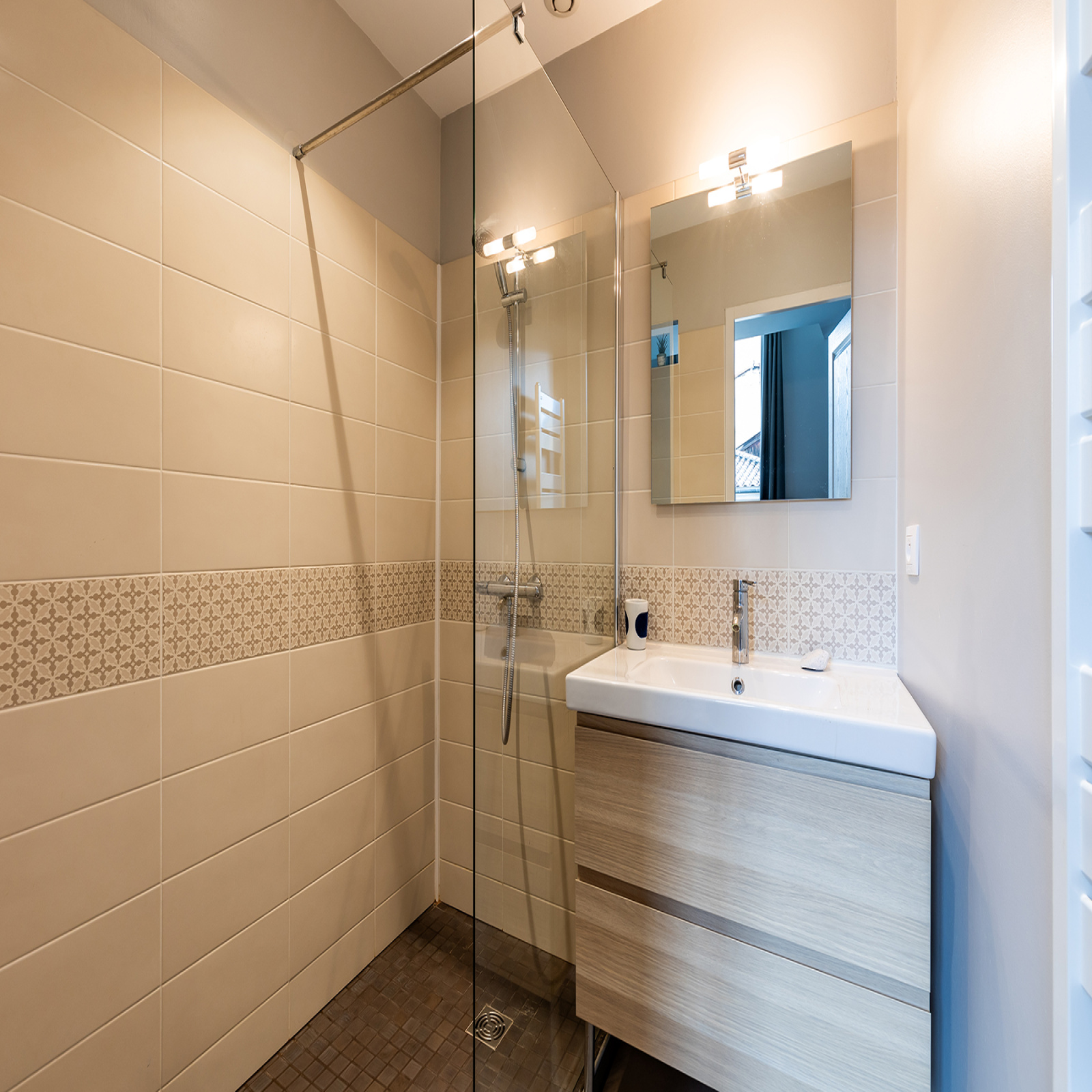 Cet appartement est composé de deux parties, dans la première partie se situe l'entrée, une chambre, une salle d'eau, une buanderie, une très belle pièce de vie lumineuse avec quatre ouvertures en façade, une cuisine semi-ouverte aménagée et entièrement équipée avec une arrière cuisine. À l'étage une suite parentale récemment rénovée en 2019 avec une salle de douche privative, deux dressings et un espace bibliothèque. Dans la seconde partie deux grandes chambres, une salle de douche et un bureau ou une cinquième chambre en étage avec salle de bain et wc. Cet espace bureau offre la possibilité de créer éventuellement une terrasse de type tropezienne sur l'arrière de l'appartement.