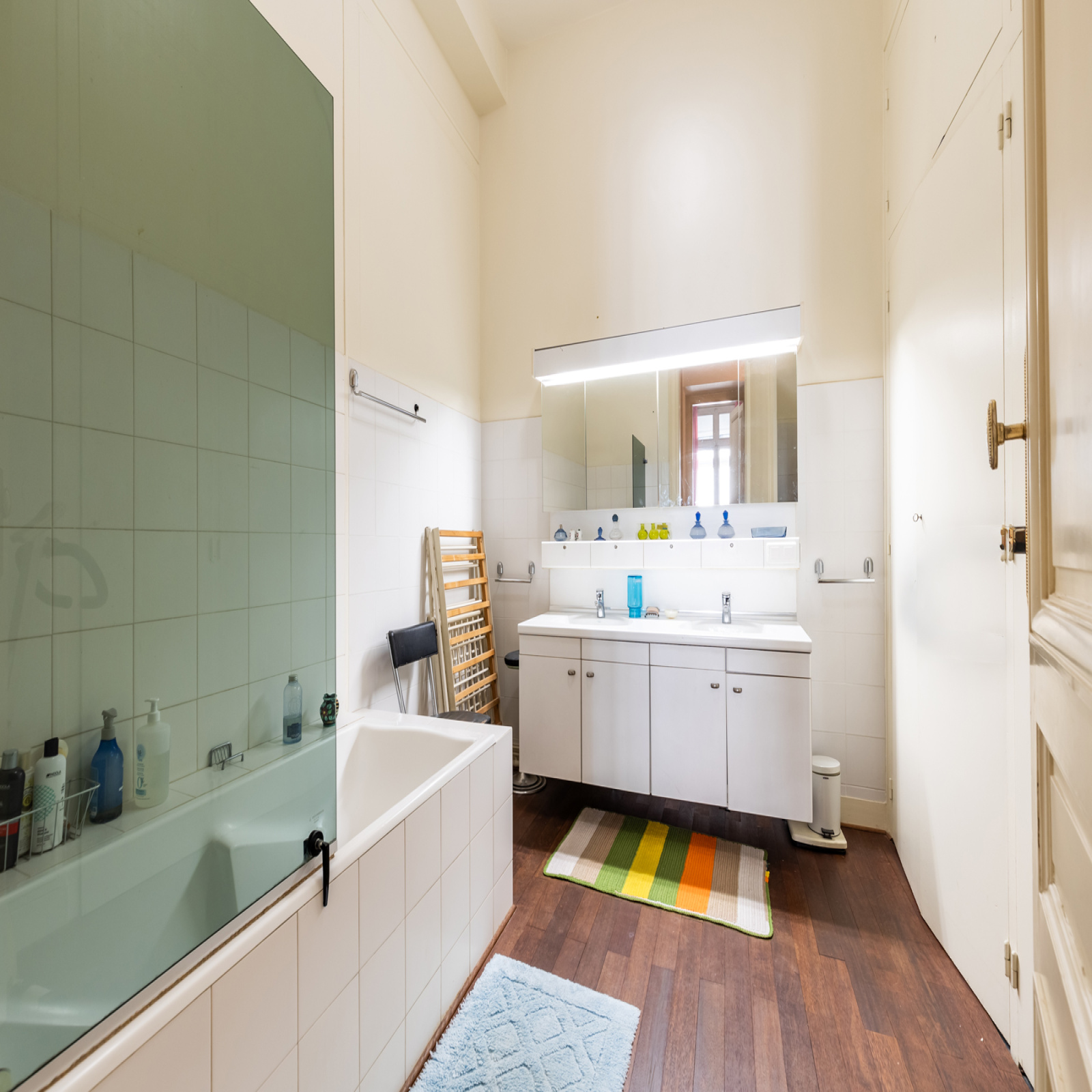 Les volumes sont très généreux, la lumière extérieure traverse l'appartement continuellement avec sa double exposition EST/OUEST, de très nombreux placards sont présents dans toutes les pièces.