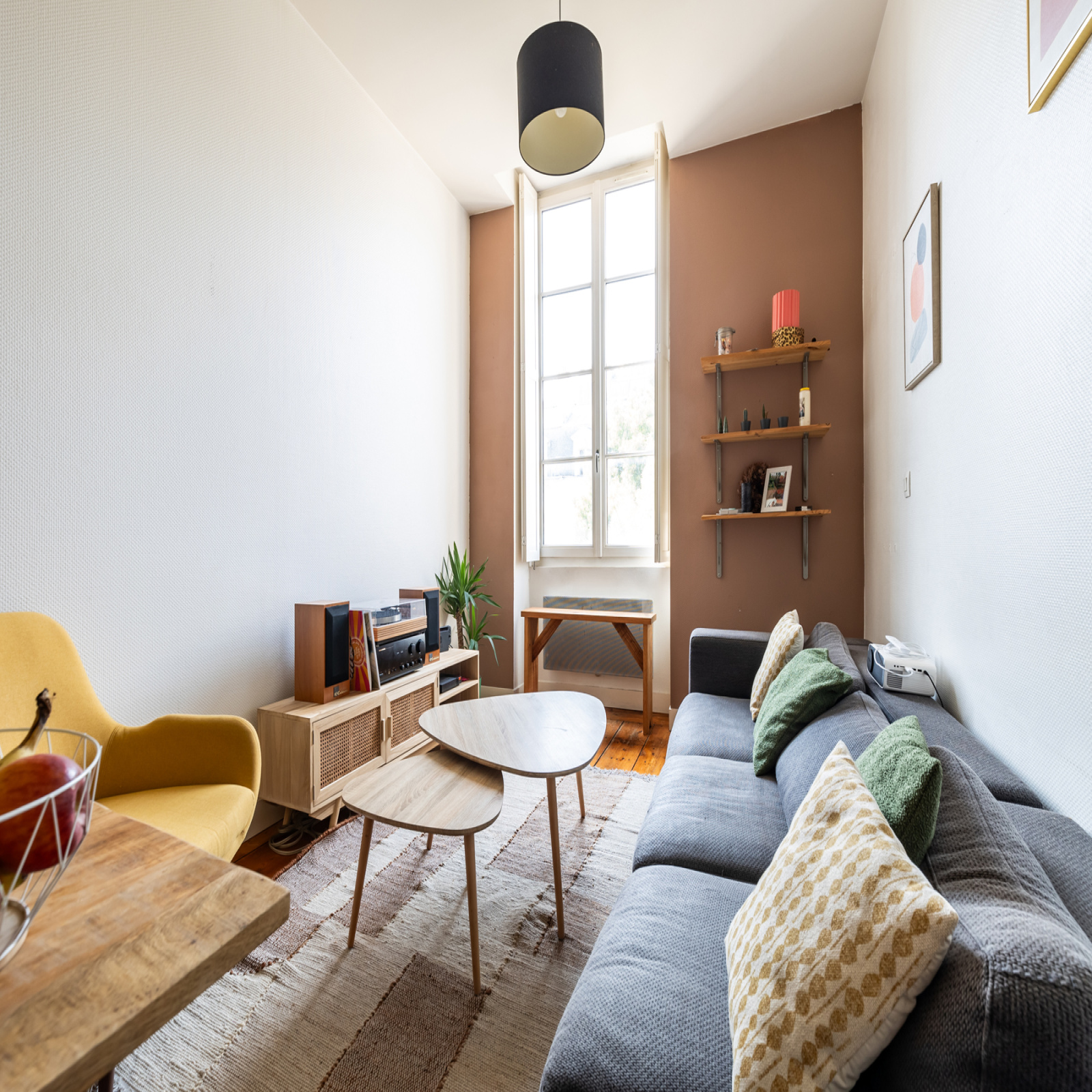 Dans un bel immeuble pierre ce charmant appartement est composé d'une entrée, d'une pièce à vivre lumineuse avec une cuisine ouverte, de 2 chambres dont l'une avec placard, d'une salle d'eau et d'un wc séparé.