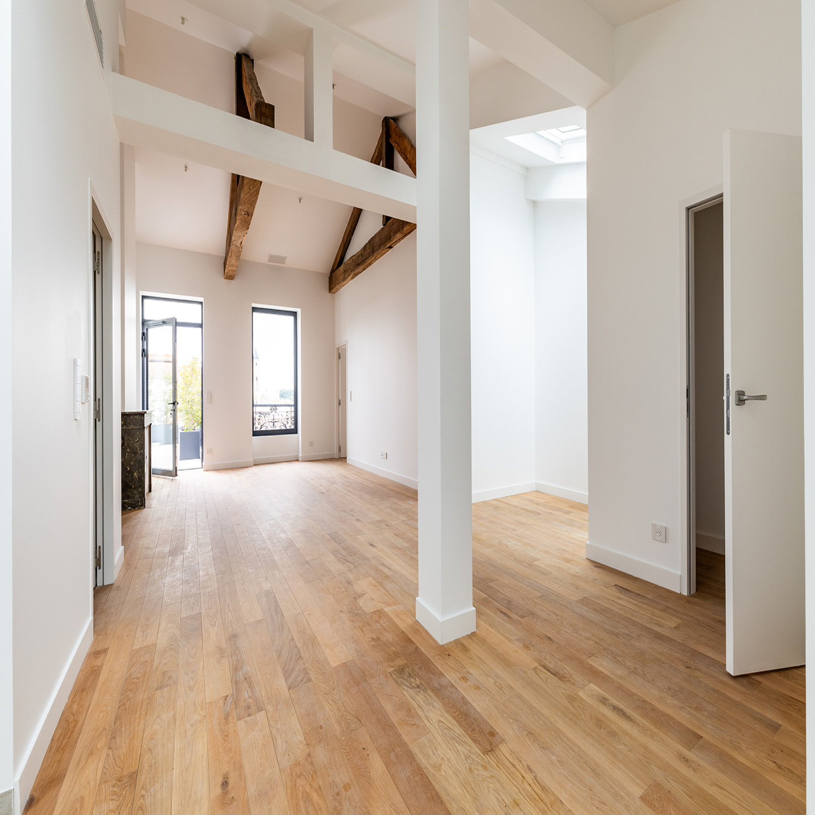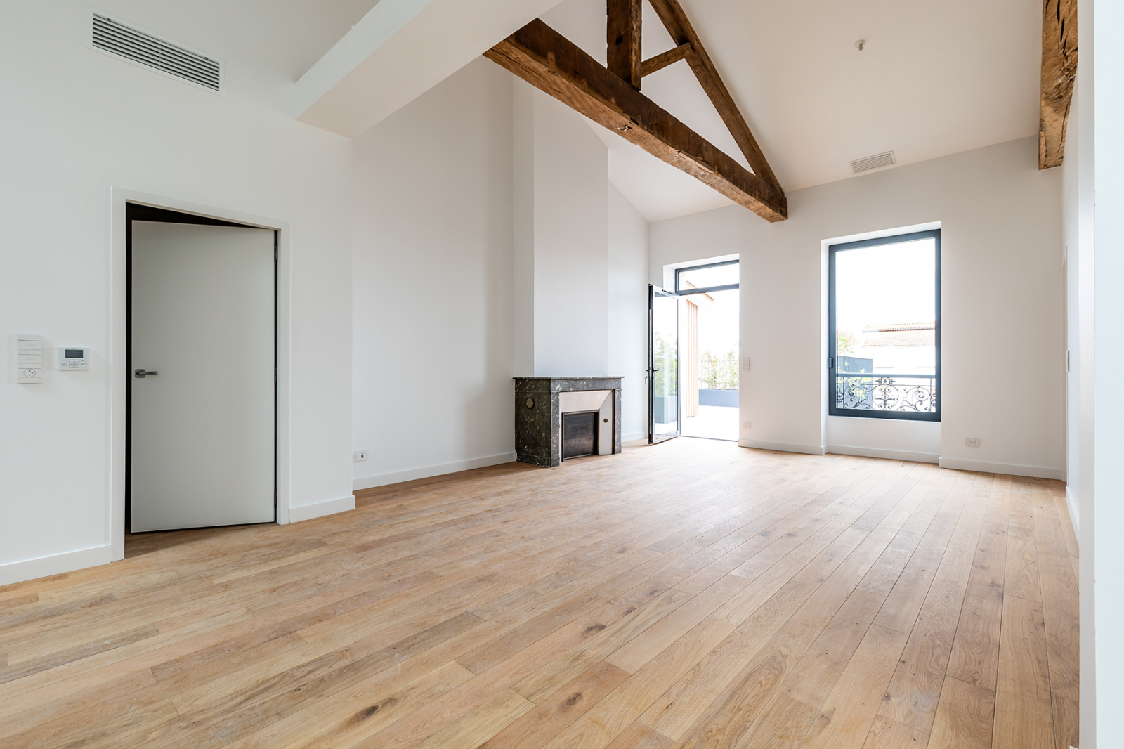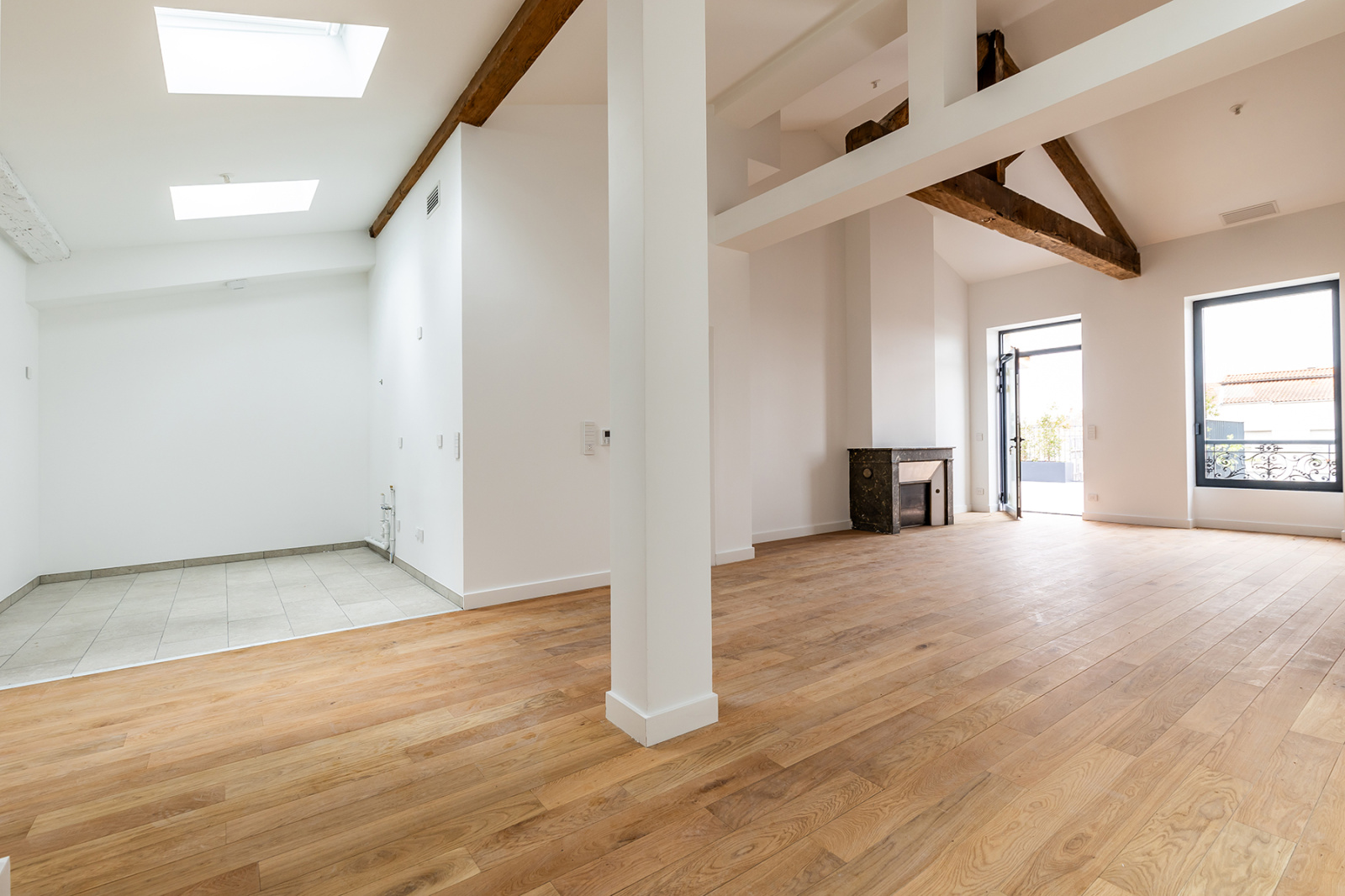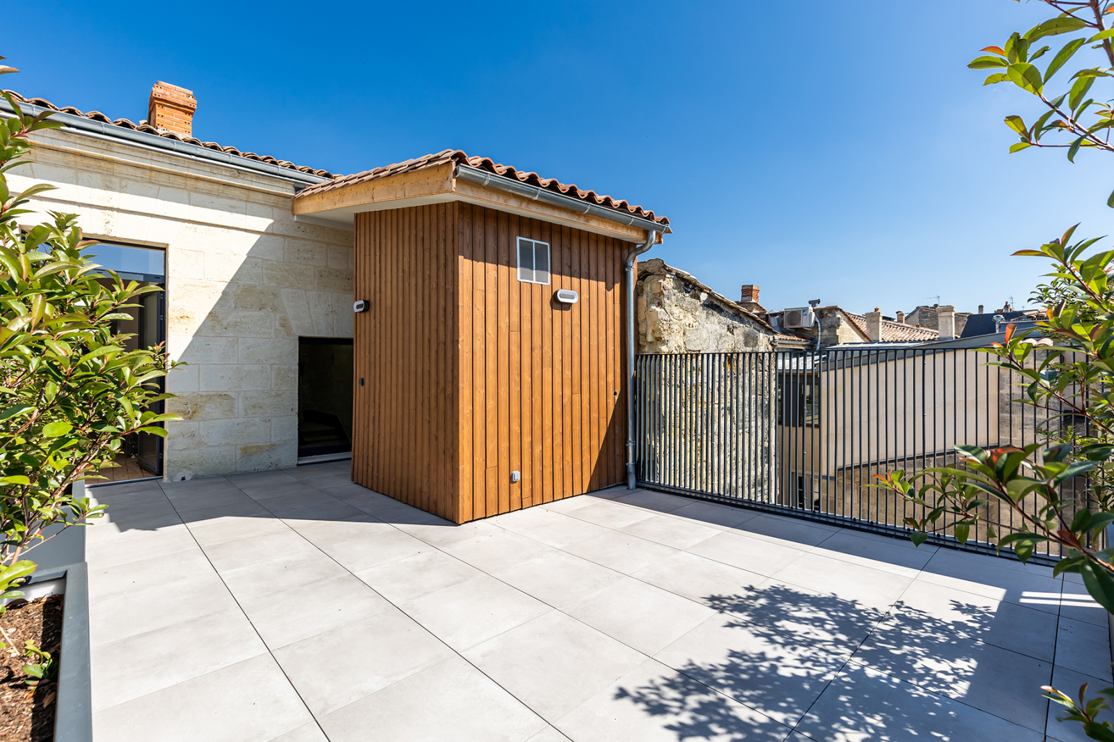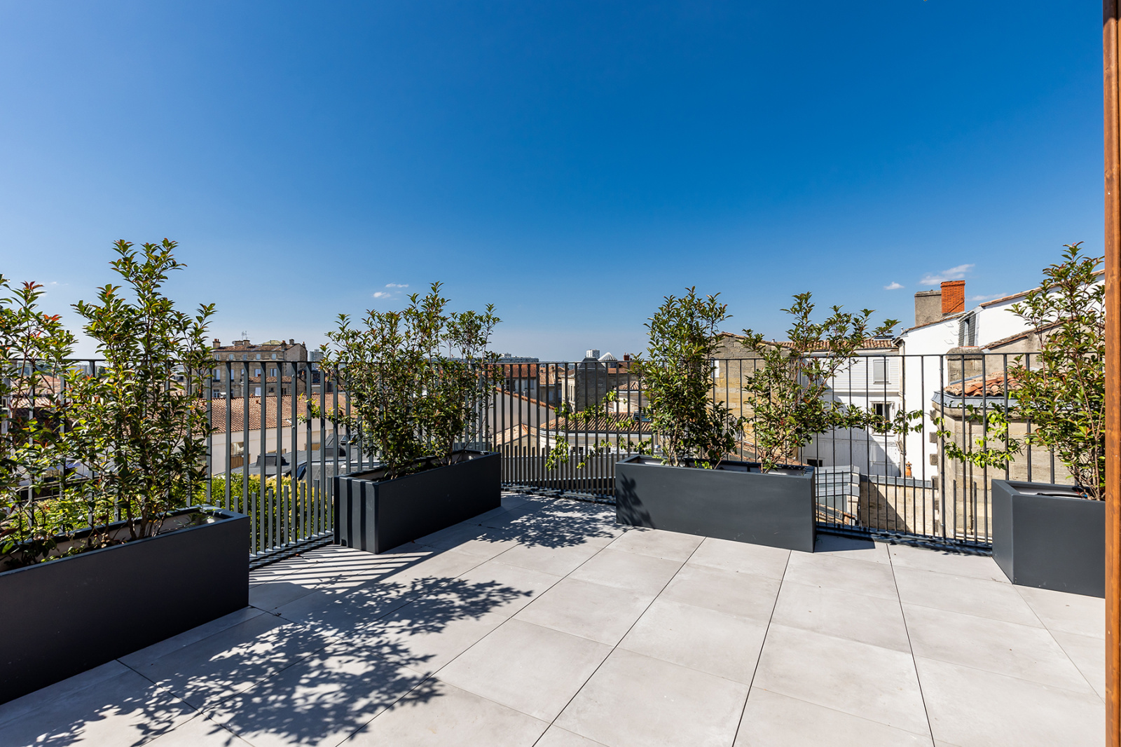 L'appartement totalise une surface au sol de 106m2 avec terrasse végétalisée de 34,63m2, vue imprenable sur les toits bordelais.