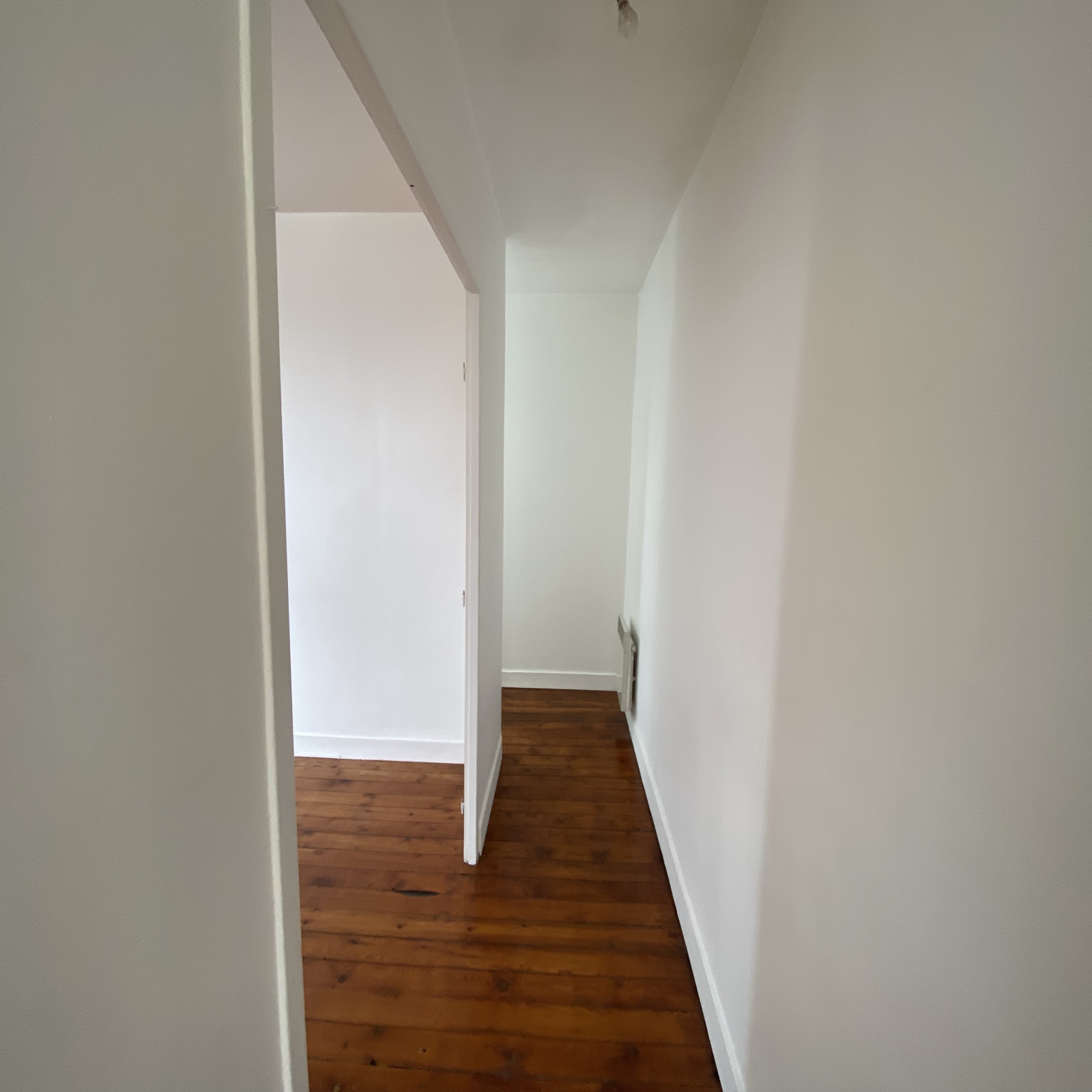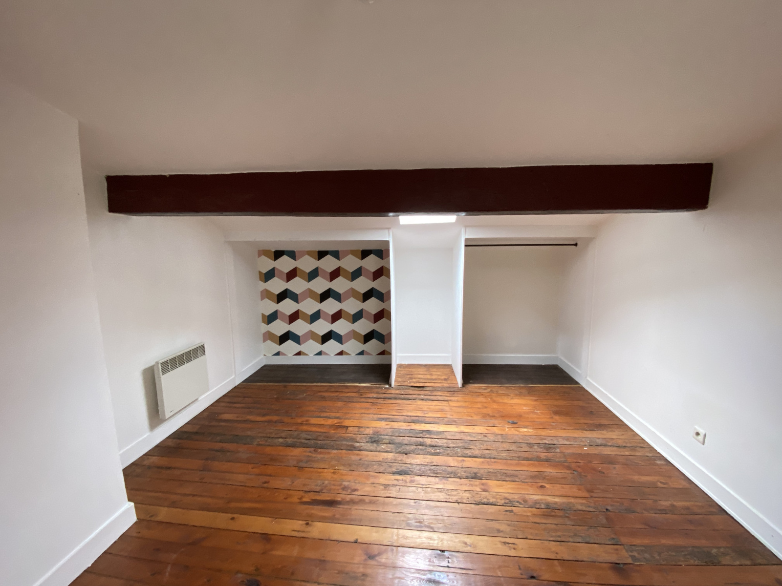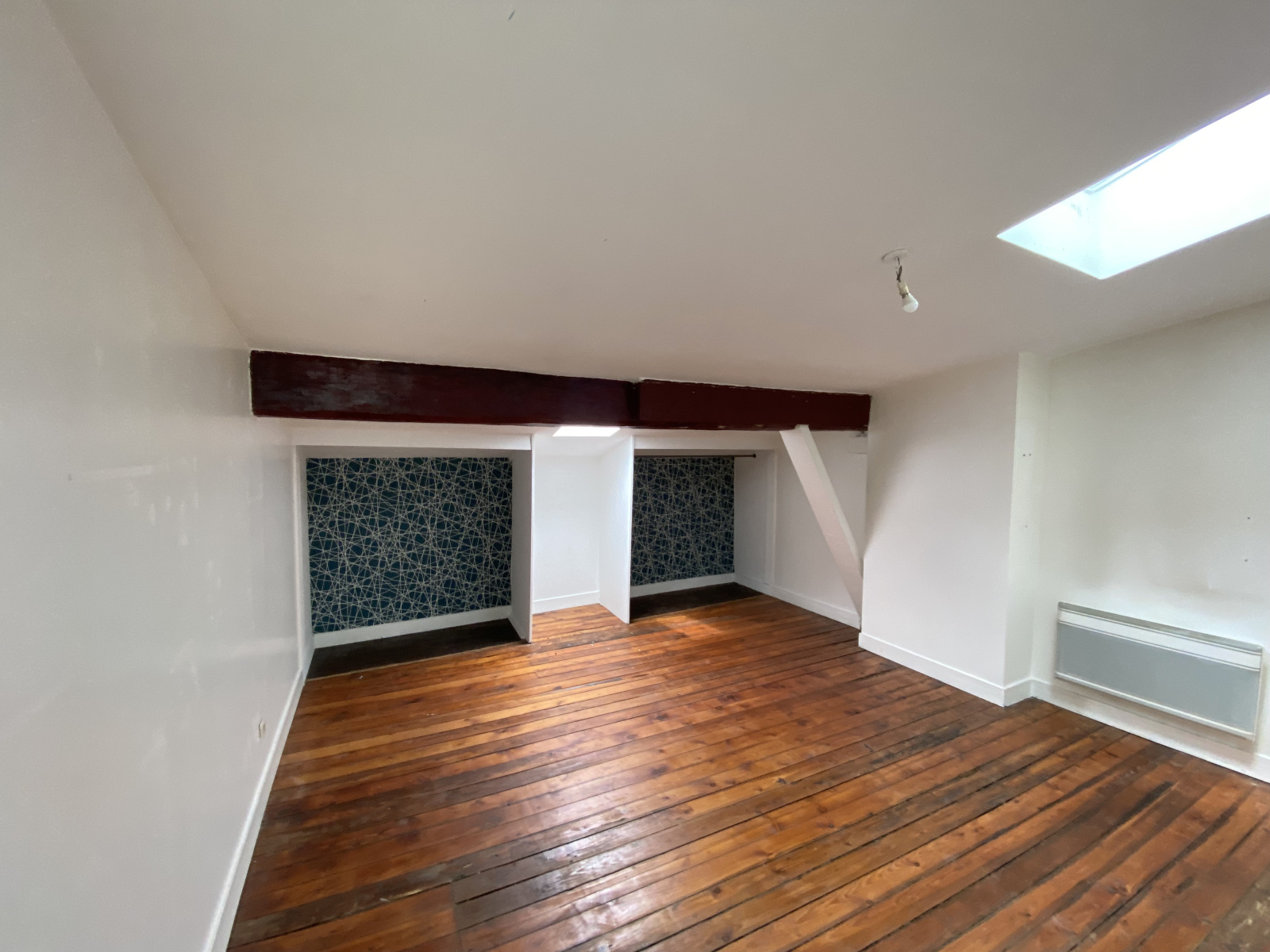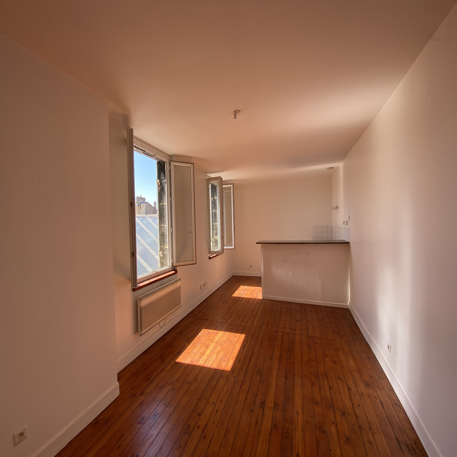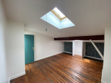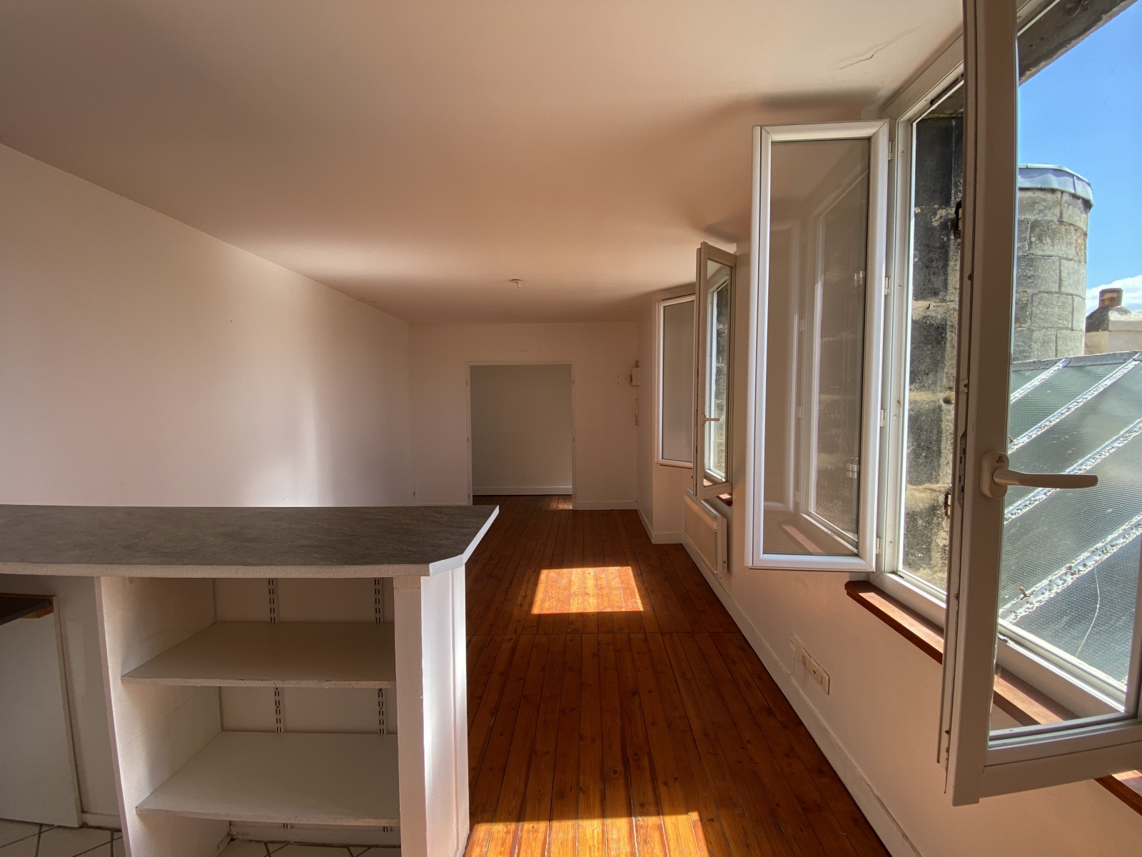 L'appartement se compose d'une pièce de vie lumineuse sans vis-à-vis avec vue imprenable sur les toits, cuisine ouverte non-équipée, deux chambres et une salle de bain avec wc.