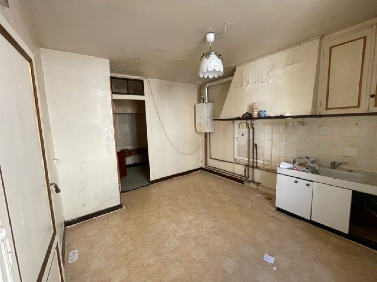Elle se compose en rez-de-chaussée d'une entrée avec carreaux de ciment, desservant une cuisine avec cellier et une pièce sur rue, un wc.