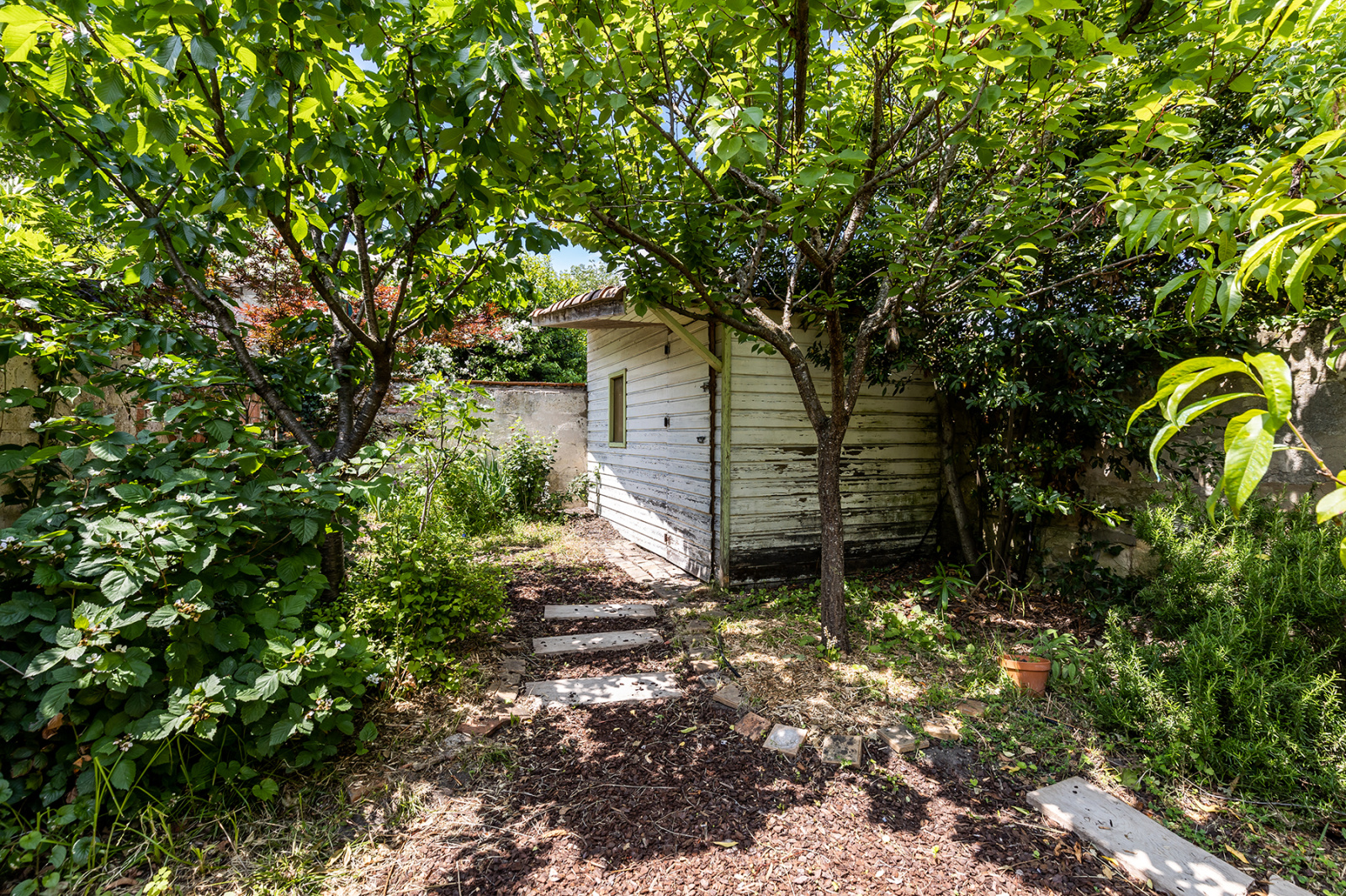 En rez-de-chaussée, la maison se compose d'une entrée avec bel escalier en pierre d'époque, un accès au garage, la cave, la buanderie et une belle pièce de vie de 60m2 baignée de lumière sur extension avec cheminée fonctionnelle et cuisine ouverte donnant sur un jarbin arboré sans vis-à-vis exposé plein OUEST. Un abri de jardin se situe en fond de parcelle.