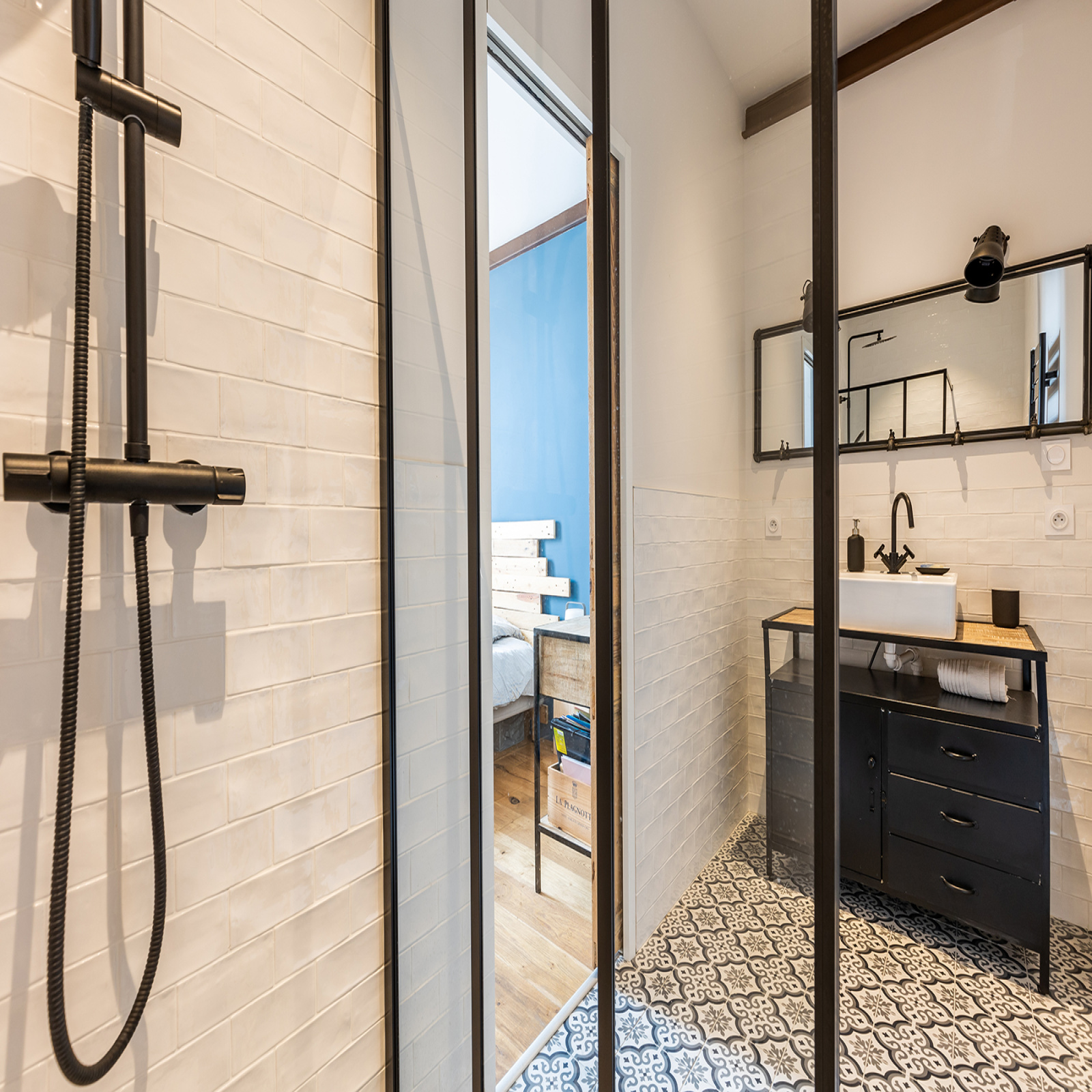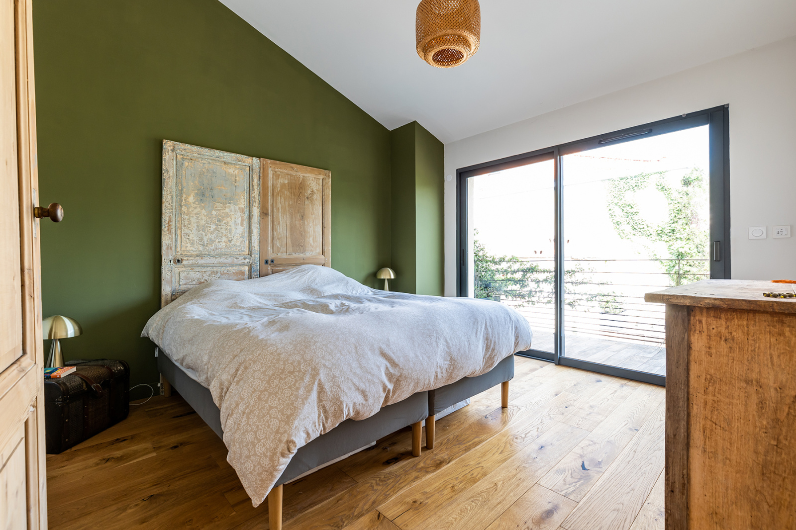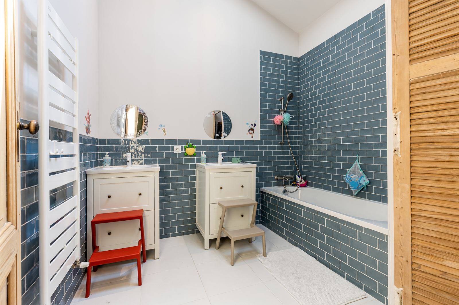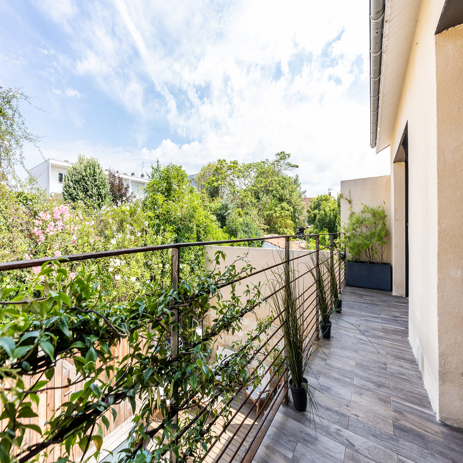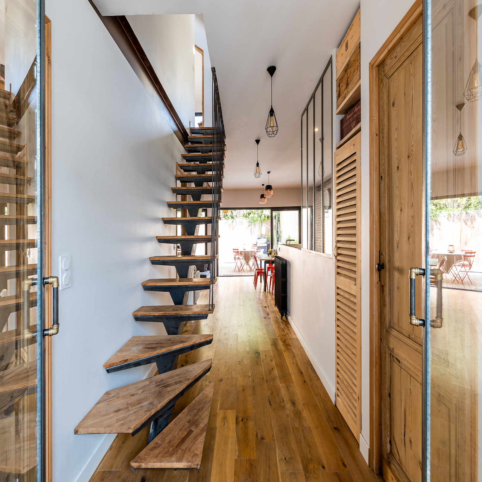Un bel escalier en acier et bois vous amène au premier étage où se trouve trois chambres dont une suite parentales avec dressings et salle d'eau privative. Deux chambres donnent sur la jardin sans aucun vis-à-vis avec accès sur une terrasse partagée. Une salle de bain avec double vasque complète ce niveau.