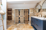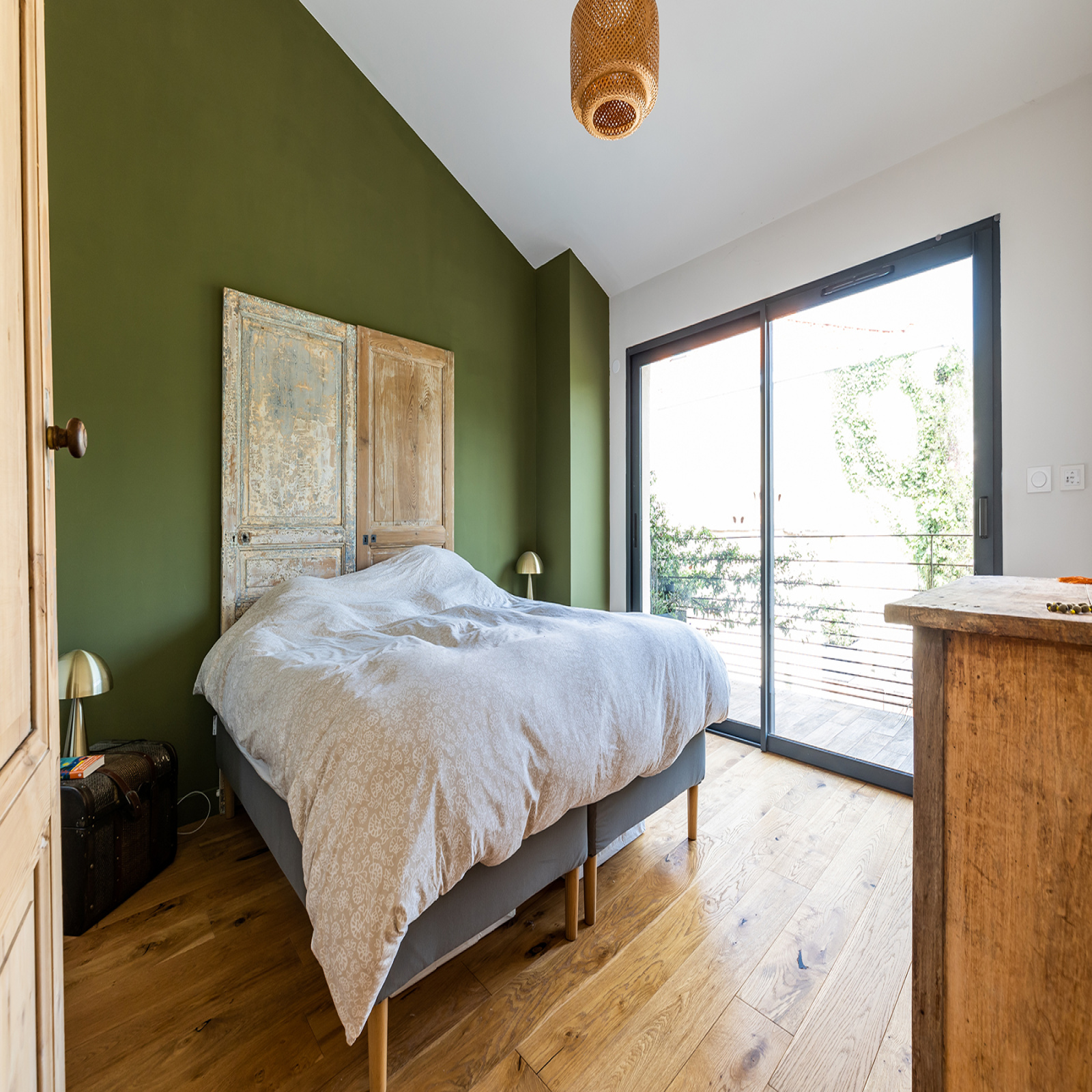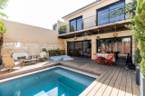En rez-de-chaussée, cette maison se compose d'une entrée indépendante avec placards, une pièce de vie baignée de lumière avec de grandes baies vitrées coulissantes en aluminium donnant sur un jardin terrassé avec piscine, une cuisine ouverte équipée, une cave à vin et une chambres avec salle d'eau privative.