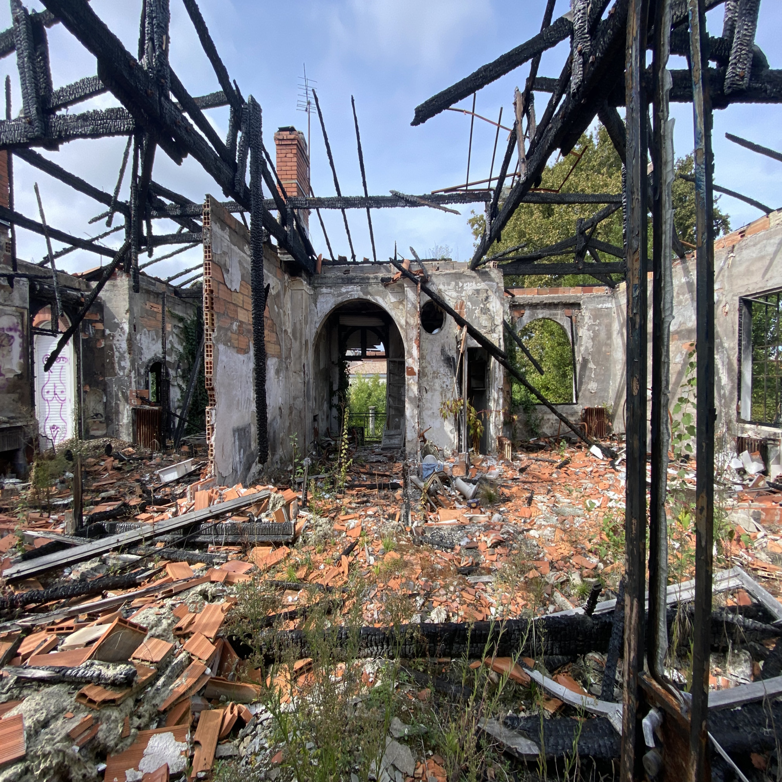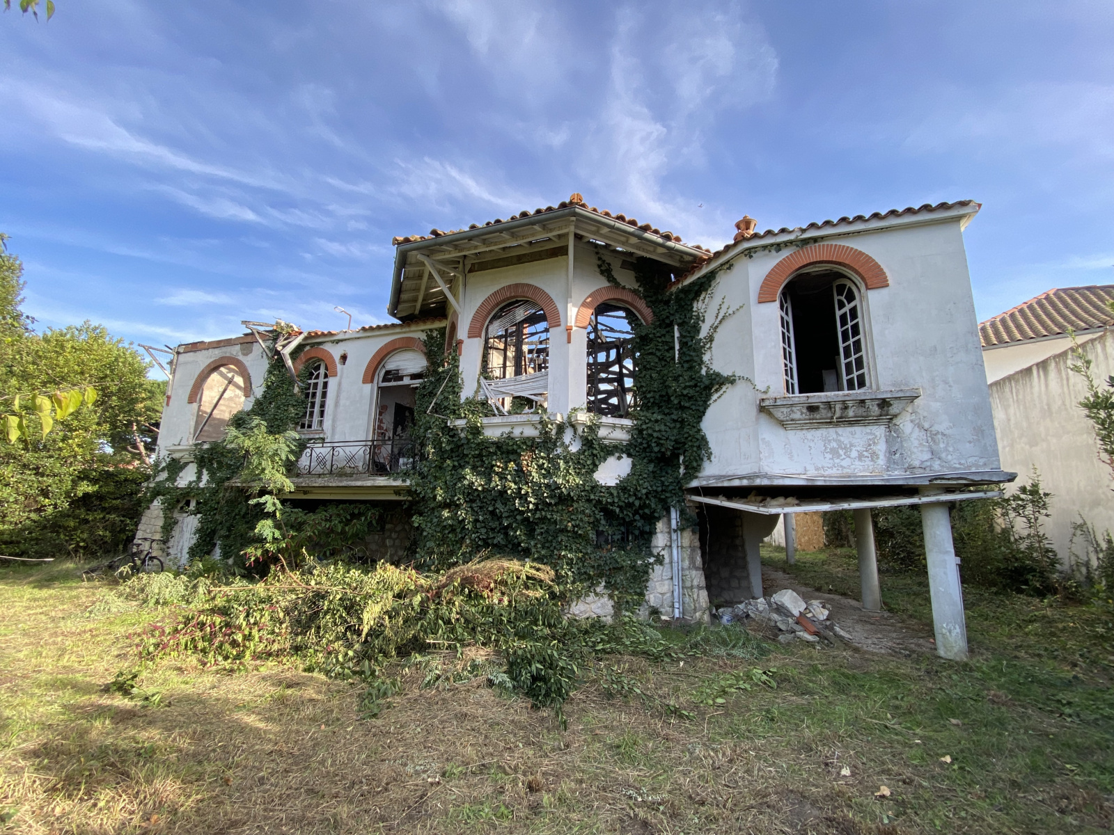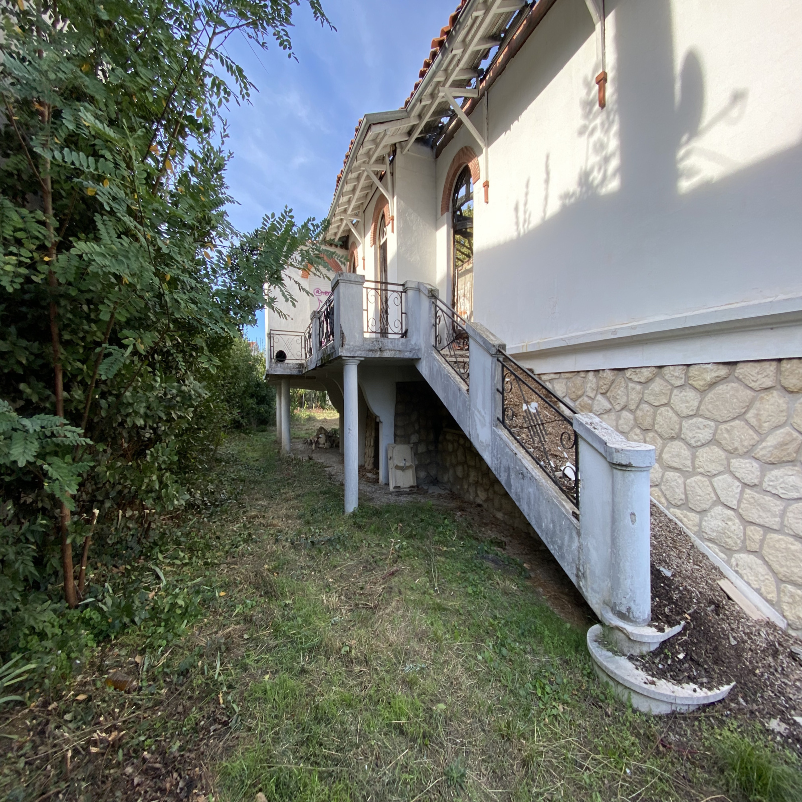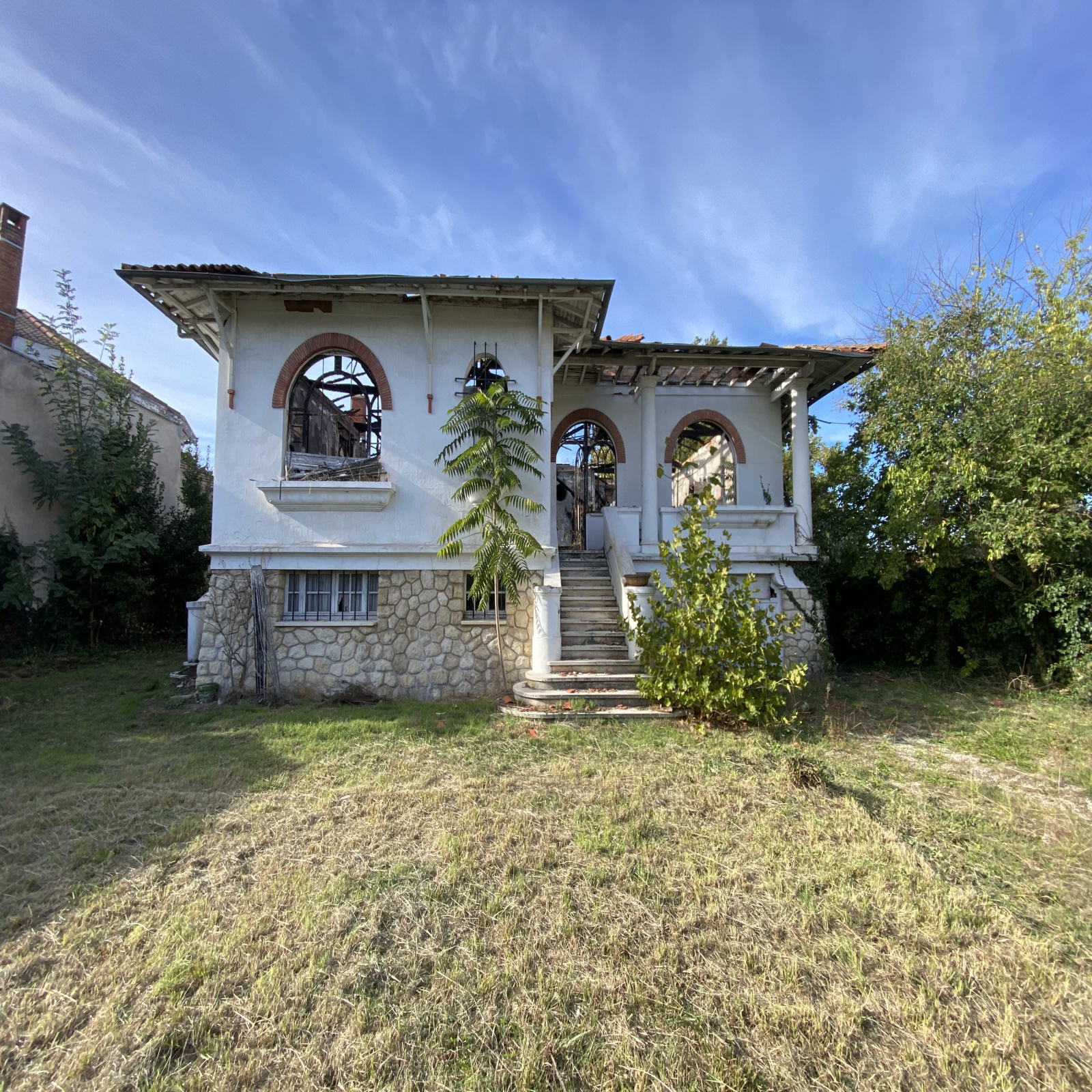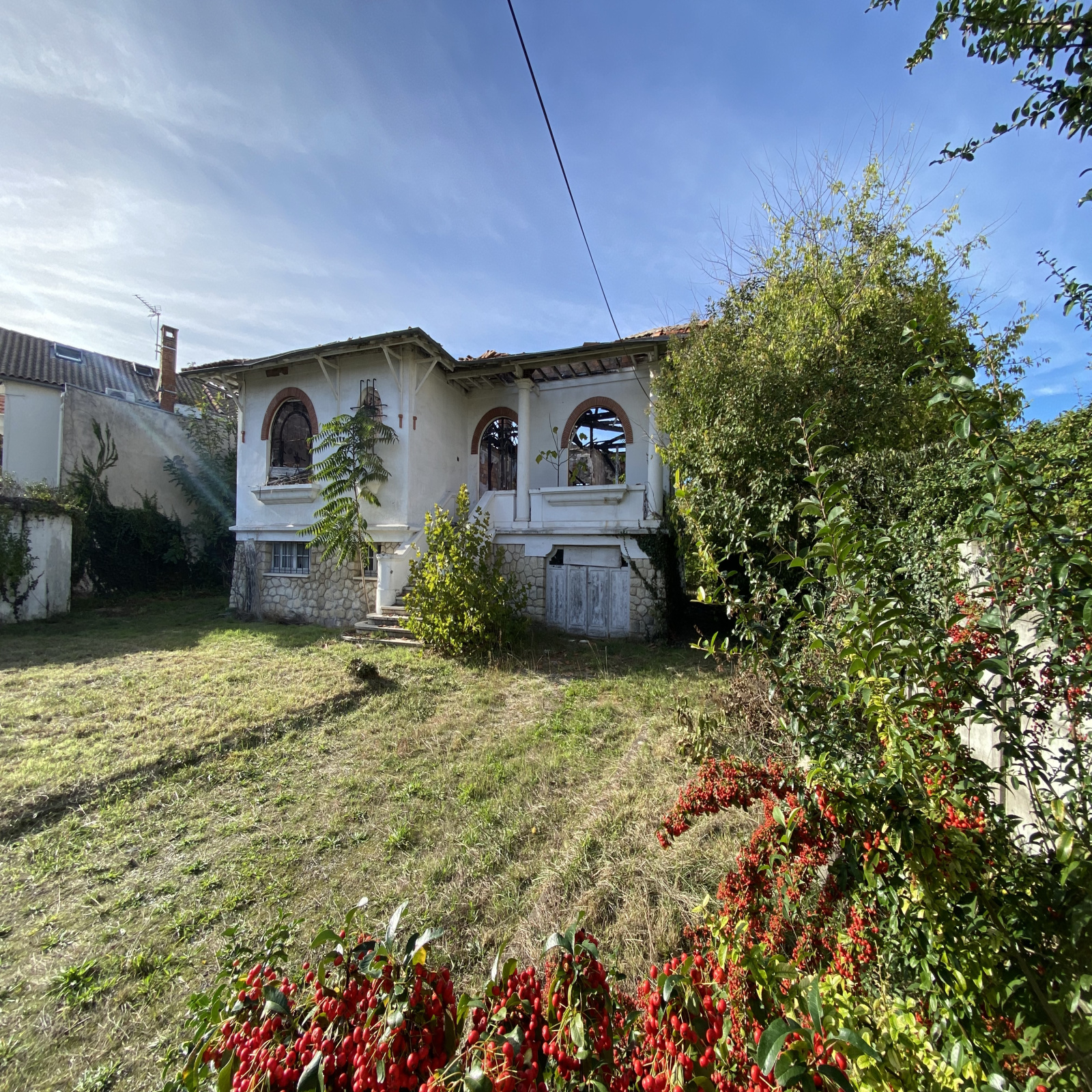 Ensemble immobilier constitué, en l'état, de deux maisons, une première maison avec garage en front de parcelle qui a subi un incendie et une deuxième bâtisse en font de parcelle à rénover avec jolie façade pierre, combles et cave.