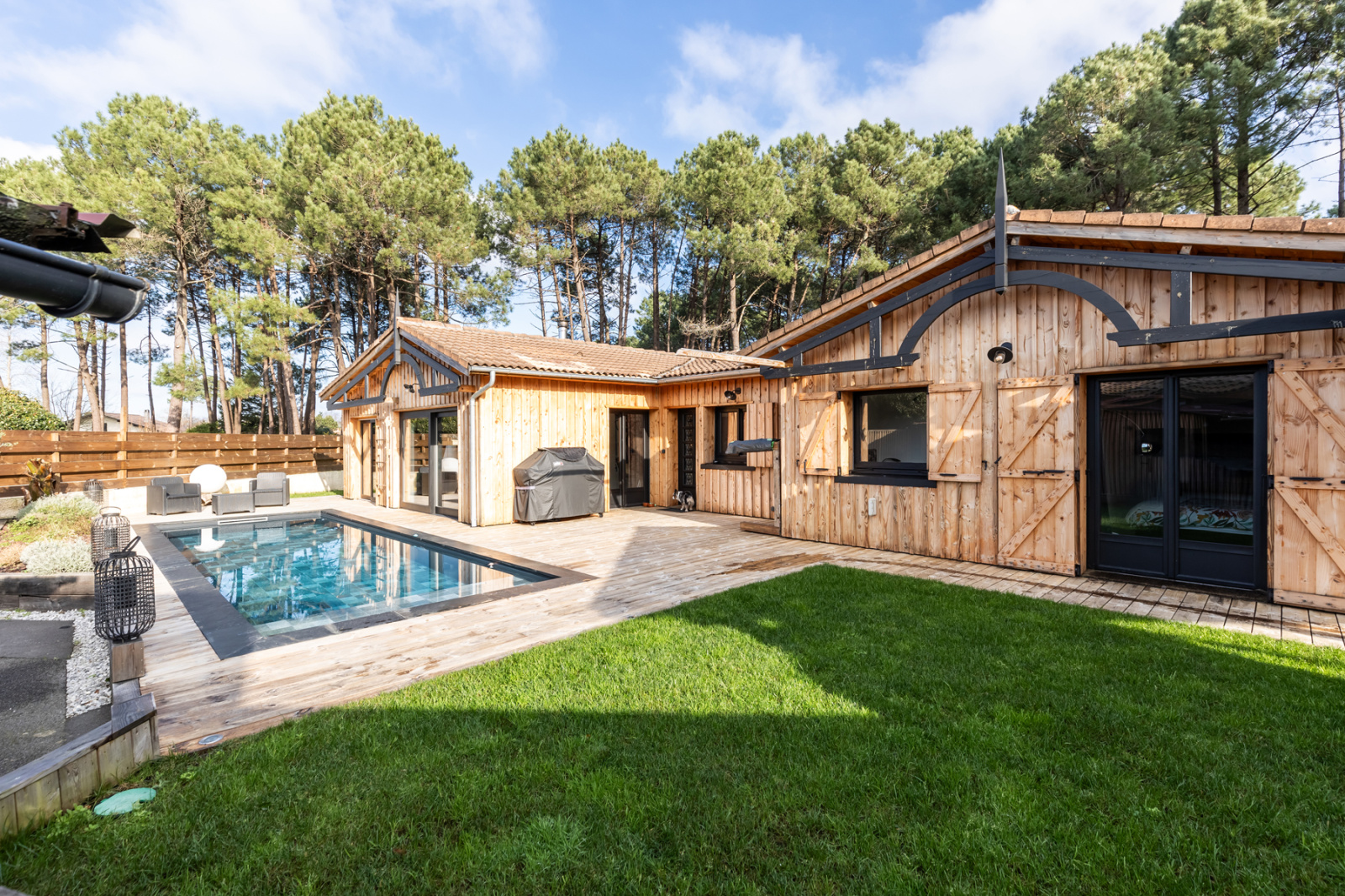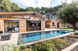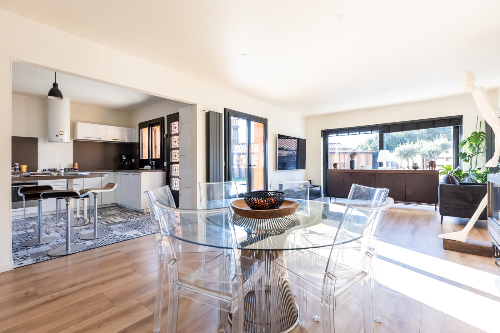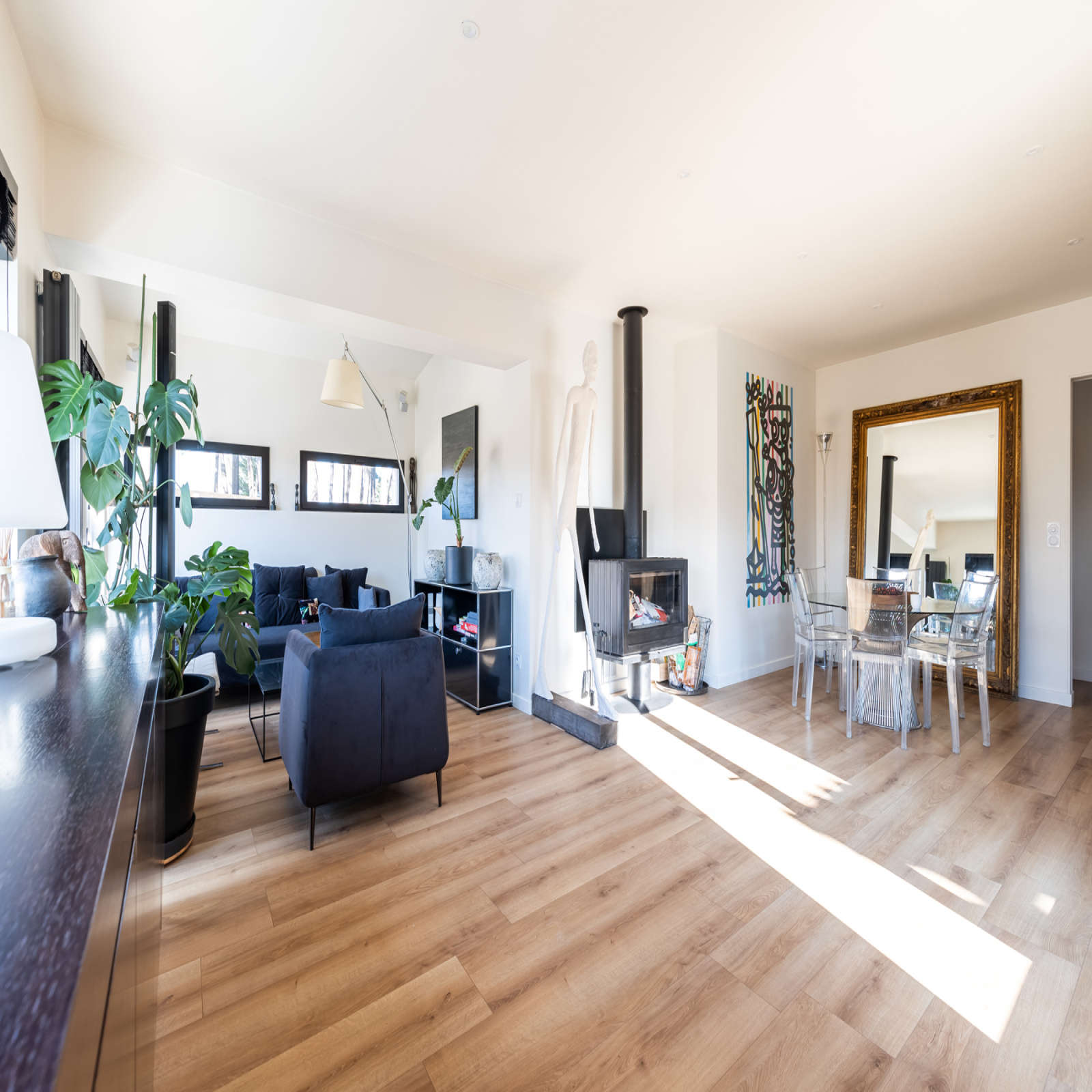 Cette maison baignée de lumière avec ses multiples ouvertures, se compose coté jour d'une grande entrée, une pièce à vie de 50m2 avec baies vitrées coulissantes face à la piscine avec poêle à bois, une cuisine ouverte entièrement équipée.