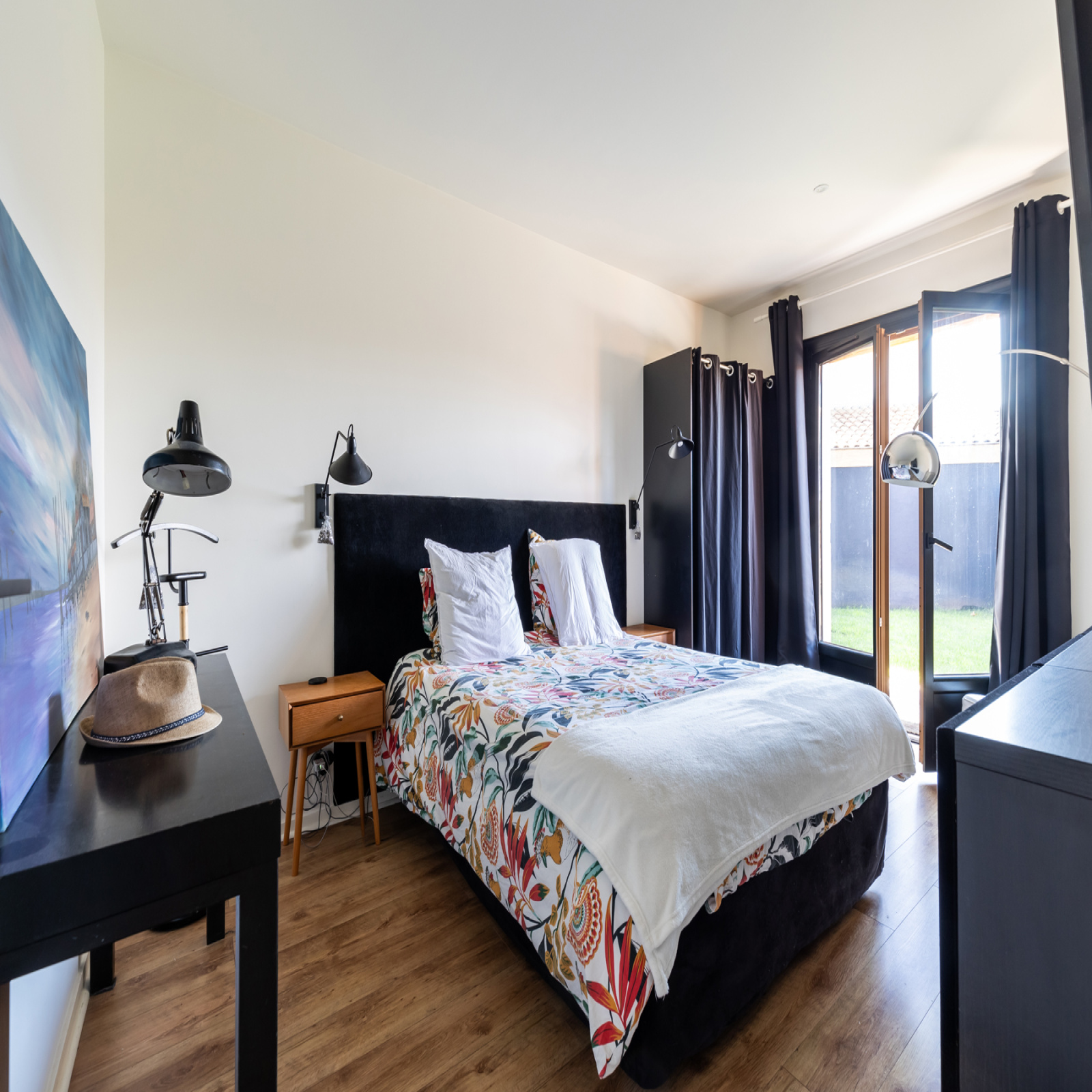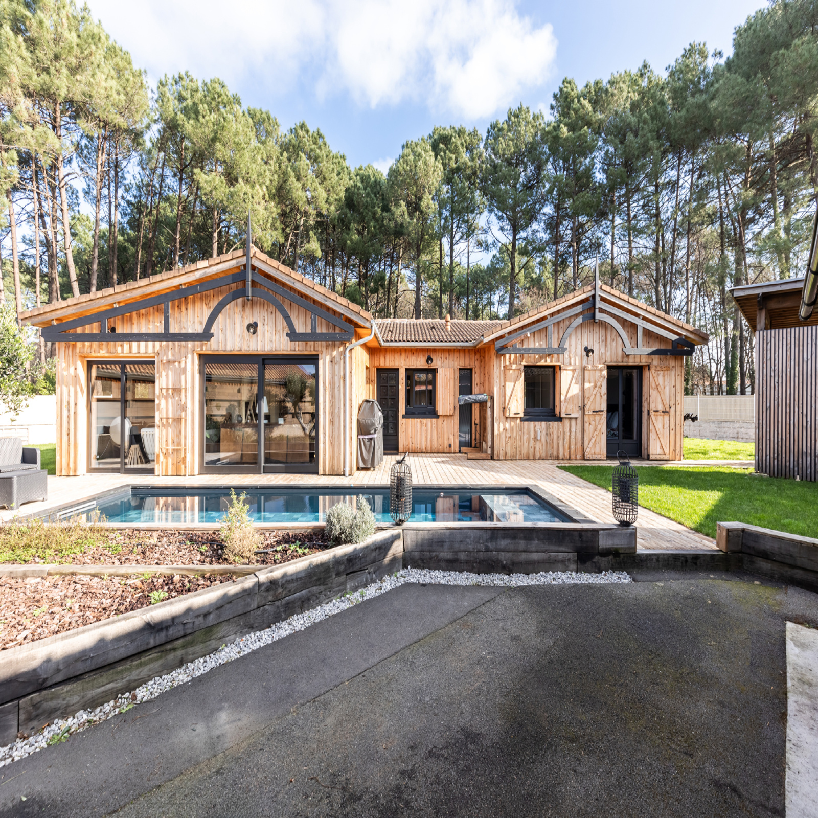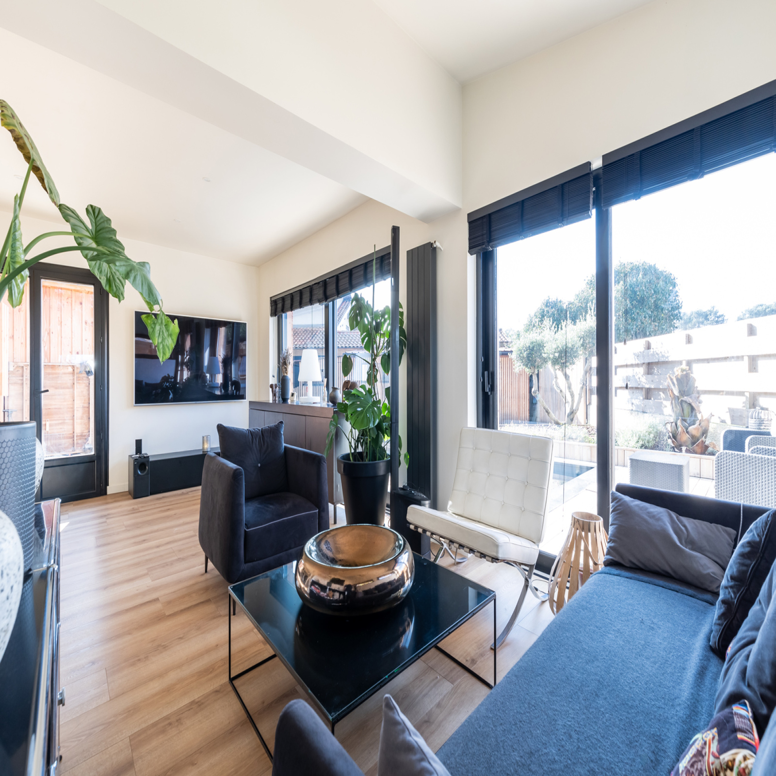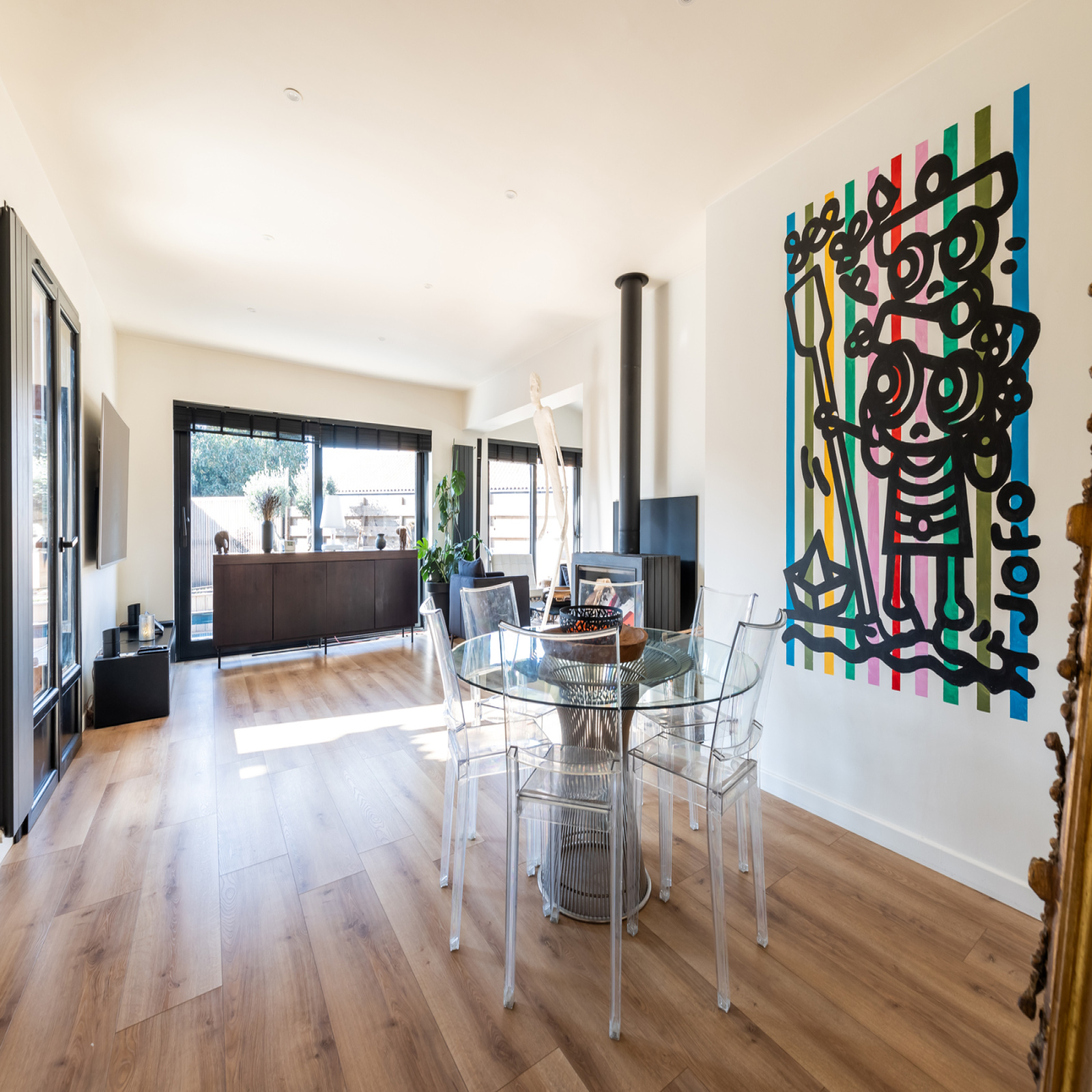 Cette maison baignée de lumière avec ses multiples ouvertures, se compose coté jour d'une grande entrée, une pièce à vie de 50m2 avec baies vitrées coulissantes face à la piscine avec poêle à bois, une cuisine ouverte entièrement équipée.